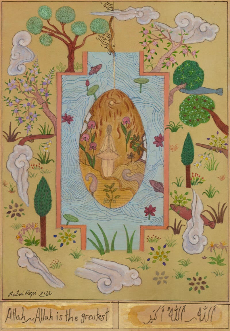 I have used mountains in this painting because the home of the legendary simurgh is the mountain. The lonely peacock is looking up at the missiles, maybe surprised of their existence, as the peacock represents beauty and here it is contrasted by the missiles which represent death and destruction. In this third one I have used the words: “HasbunAllahu wa ni’mal Wakeel”, which translates to: Sufficient for us is Allah (God), and He is the best disposer of affairs (From the Quran). The same string concept is used here.